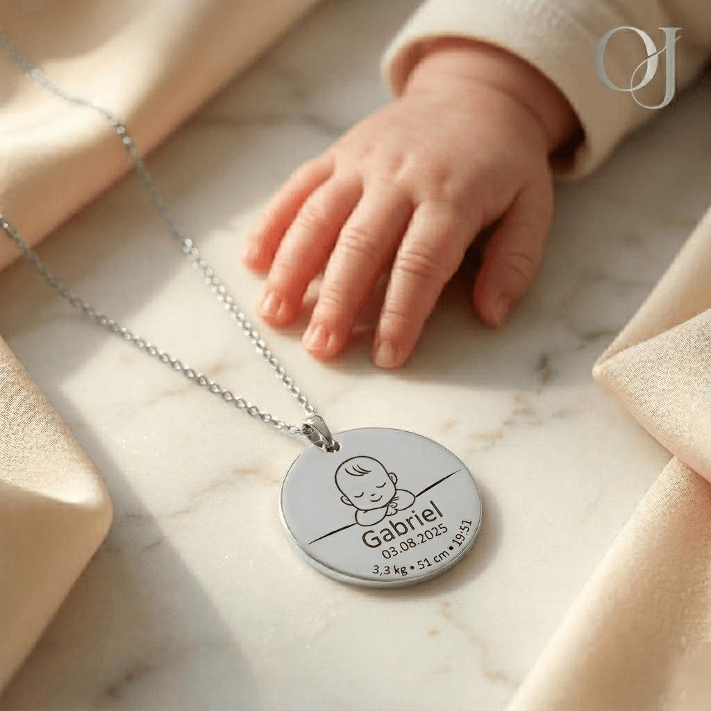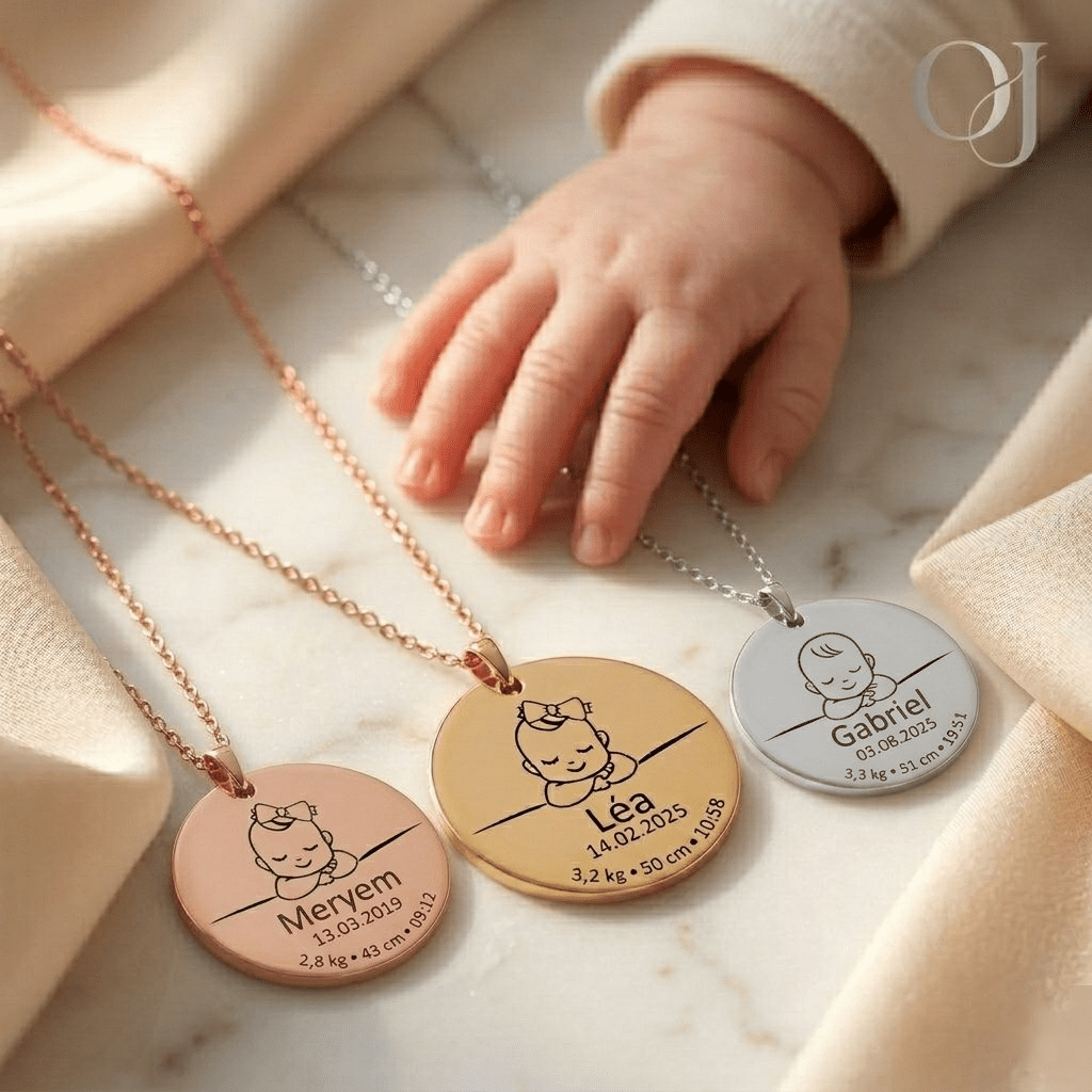 Oréa Joaillerie fabrique ce collier naissance en acier inoxydable plaqué or 18k, or rose 18k ou acier argenté. De plus, la gravure laser garantit un rendu net et durable dans le temps. Ainsi, chaque chiffre, chaque lettre reste lisible des années après. Par ailleurs, vous pouvez ajouter un message personnel au dos du médaillon pour une touche encore plus intime.